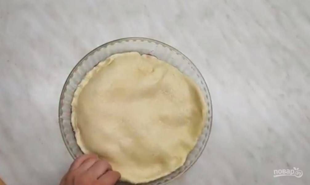 4. Выложите начинку в форму и разровняйте. Тесто раскатайте в пласт толщиной 5 мм, выложите на начинку и слегка подогните края под начинку.