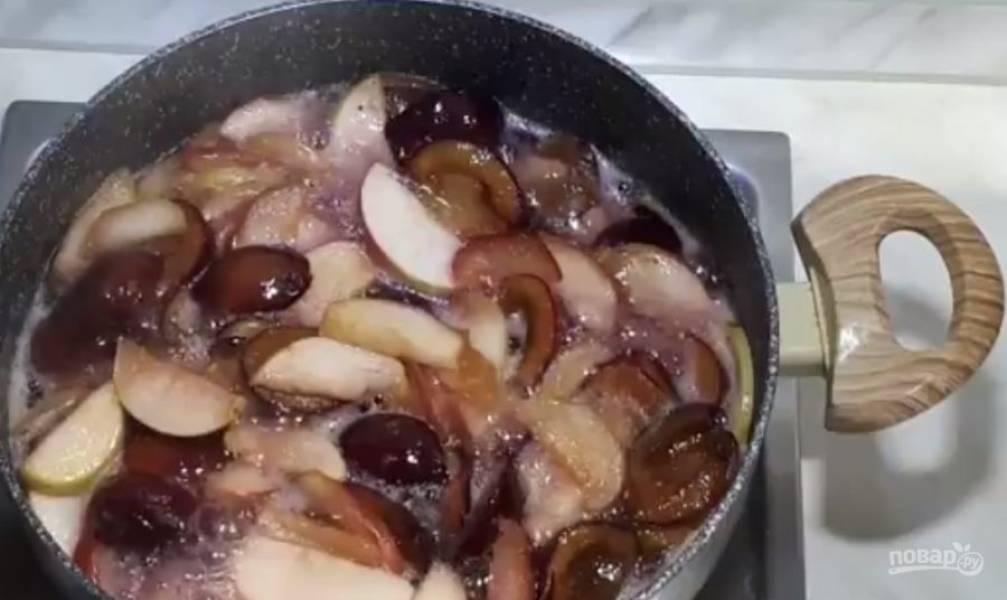 3. В разогретую сковороду вылейте воду, смешайте с сахаром и доведите до кипения. Добавьте мед и дайте сиропу закипеть. Выложите фрукты и протушите, периодически помешивая, в течение 3-5 минут. Слегка остудите начинку.