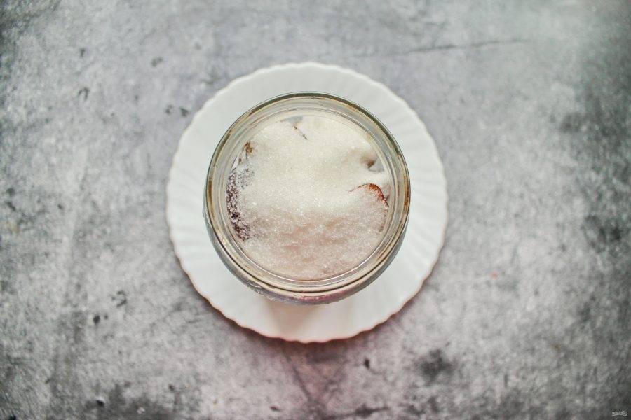 Всыпьте в банку со сливами сахар.
