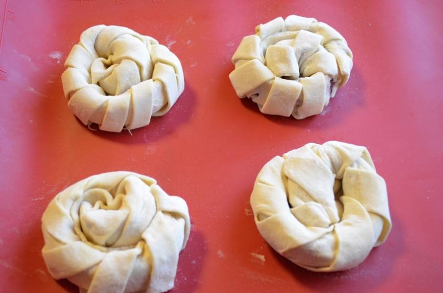 слойки выложить на противень застеленный силиконовым ковриком или пергаментом для запекания. Смазать слойки желтком и присыпать сахаром. Выпекать в разогретой духовке до 180 градусов около 35-40 минут.