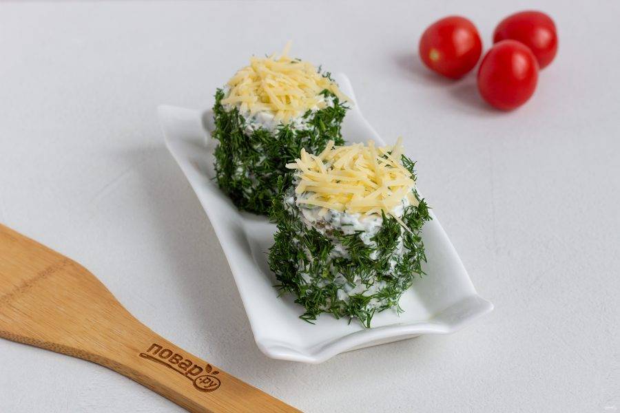 Украсьте кусочками черри и листиками петрушки или по своему вкусу. Закуска отлично стоит в холодильнике несколько часов, зелень укропа не увядает. Поэтому можно подавать сразу или через некоторое время.