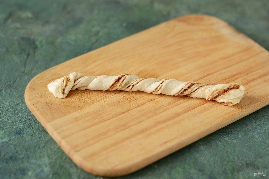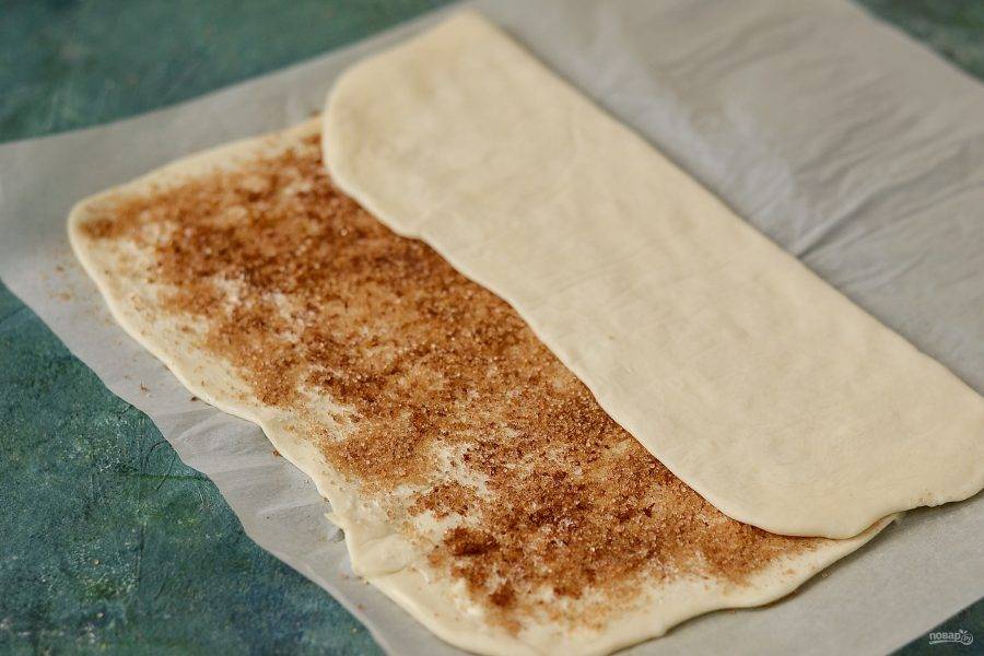 Раскатайте тесто в прямоугольник толщиной 3-4 мм.