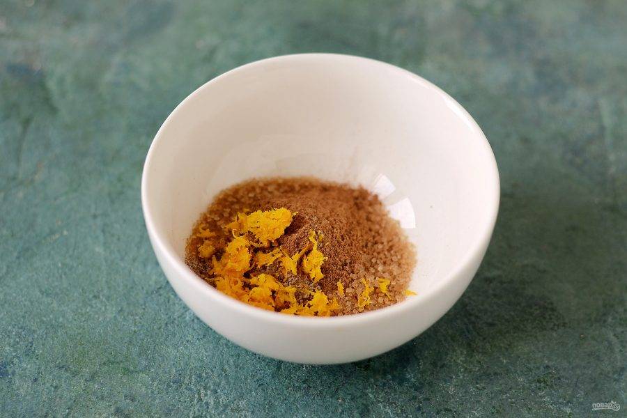В миске смешайте сахар, кардамон, корицу и апельсиновую цедру.