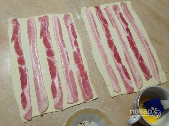 3. Тесто немного раскатаем так, чтобы лист был чуть длиннее полосок бекона. Раскладываем полоски бекона на тесте на небольшом расстоянии друг от друга.