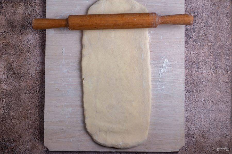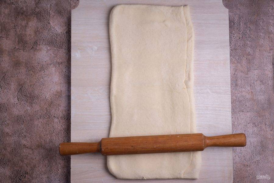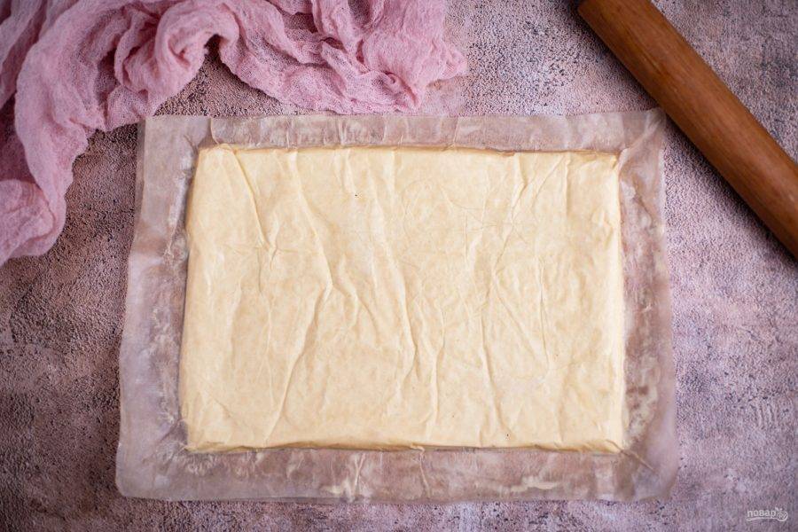 Достаньте тесто из холодильника и прокатайте его скалкой удлинняя.
