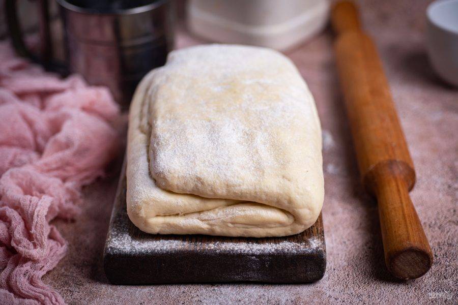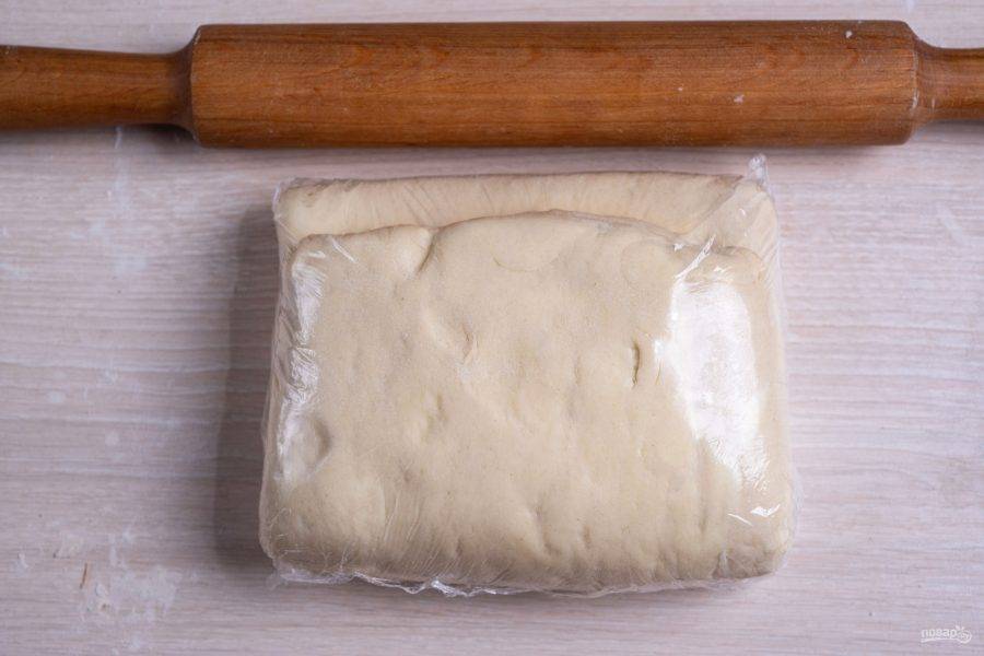 Сложенное тесто заверните в пищевую пленку и отправьте на час в холодильник — тесто должно хорошенько охладиться.