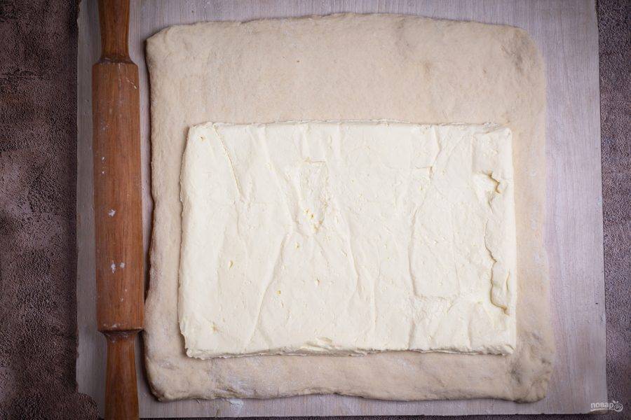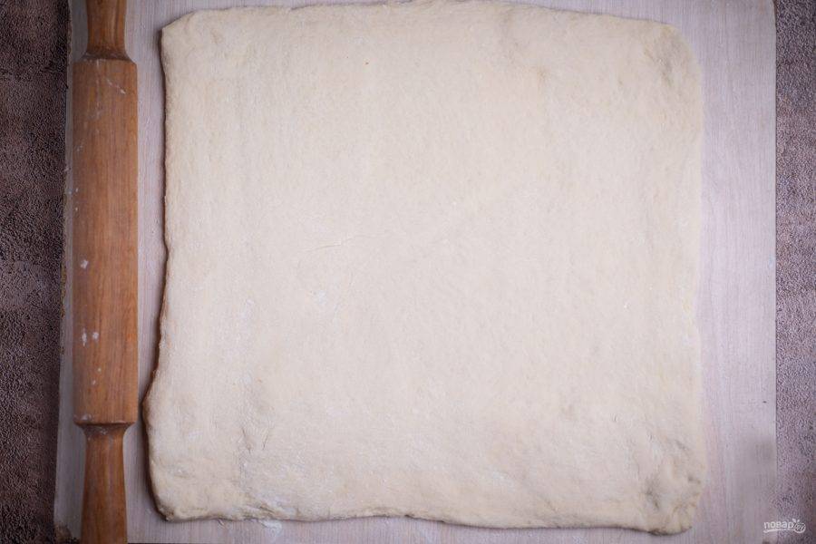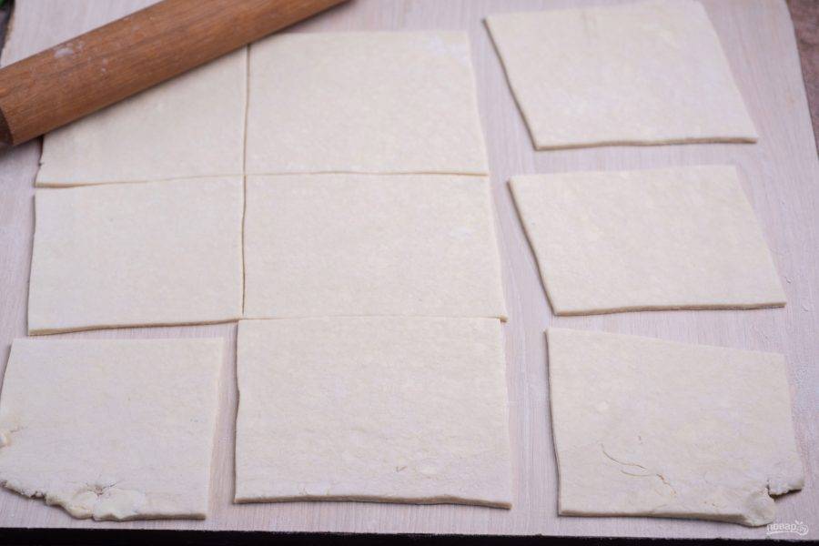 Приготовленное тесто раскатайте в прямоугольный пласт толщиной примерно в 4-5 мм. и нарежьте на квадраты.