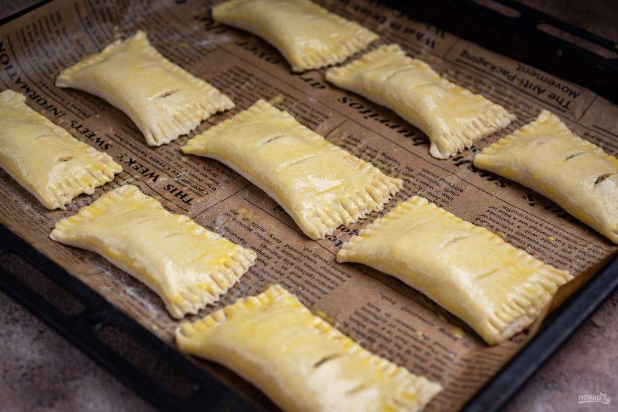 Все заготовки пирожков выложите на противень и каждую заготовку смажьте смесью взболтанного куриного желтка и 2-х чайных ложек воды. Выпекайте пирожки в заранее разогретой до 180 градусов духовке в течение примерно 20 минут.