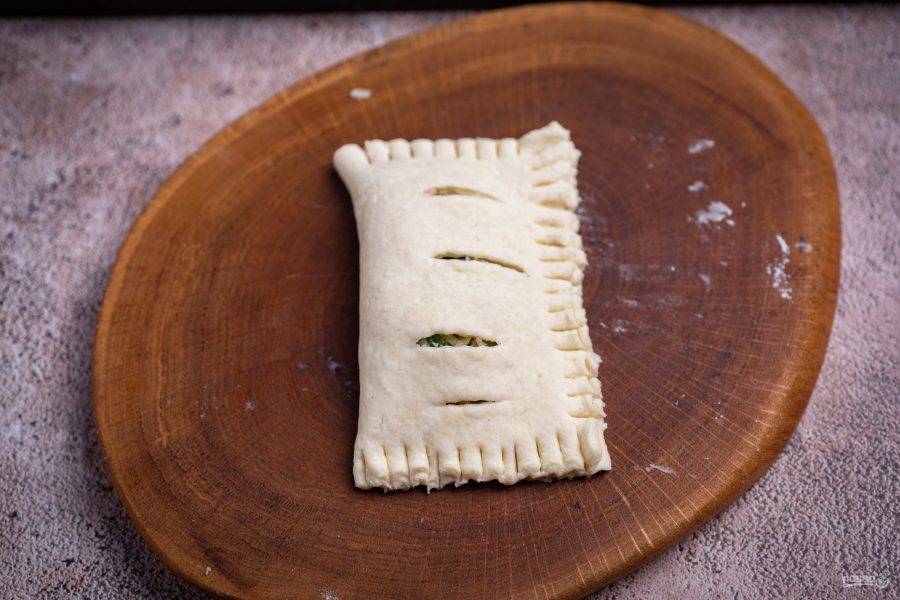 На каждый квадрат из теста на одну сторону выложите 2-3 ч.л. начинки, на свободной стороне теста сделайте 3-4 надреза.
