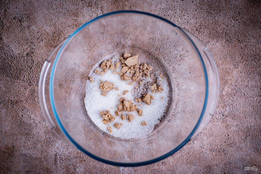 В просторную миску разотрите пальцами дрожжи и добавьте к ним сахар.