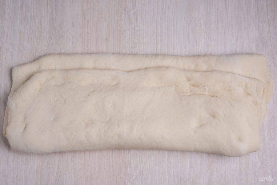 Затем этот прокатанный пласт сложите сначала третью пласта теста и сверху накройте свободной третью пласта из теста.