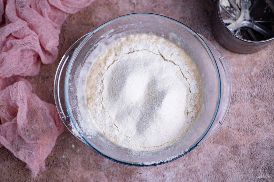 К дрожжевой смеси просейте 100 грамм муки и перемешайте все венчиком.