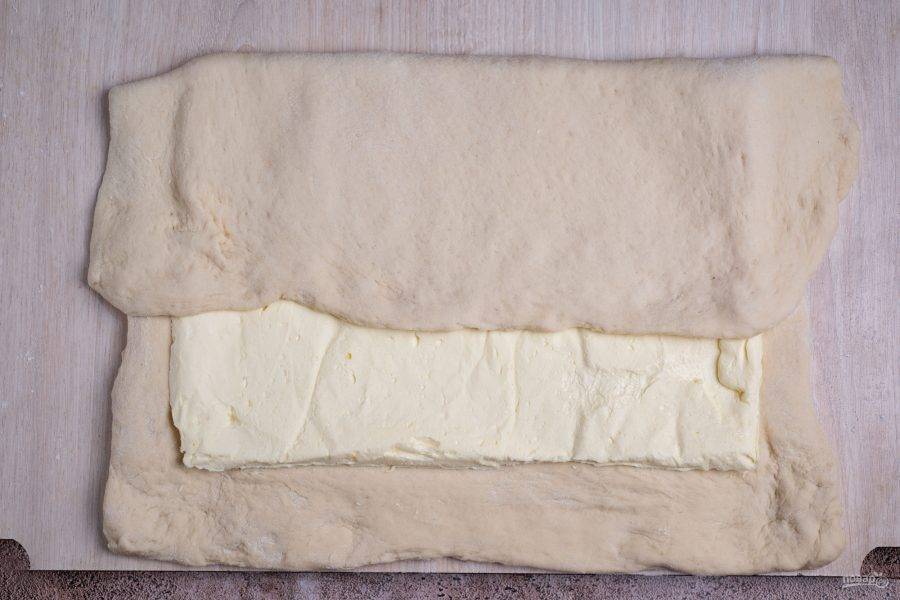 Так, чтобы масло полностью оказалось закрыто тестом.
