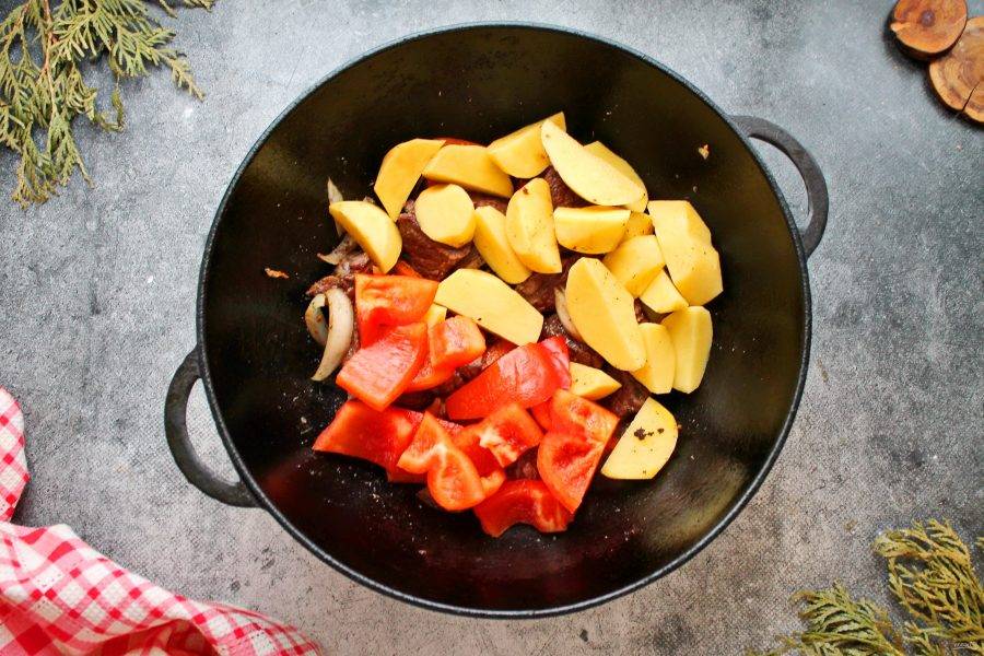 Картофель порежьте дольками, болгарский перец крупными кусками и выложите в казан. Влейте горячую воду и доведите до кипения, добавьте зелень. Закройте казан крышкой, убавьте огонь и готовьте все в течение одного часа.