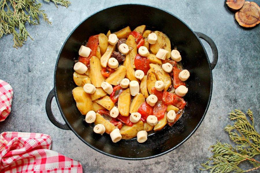 Разложите кусочки хинкала поверх овощей и мяса, закройте крышкой и готовьте еще в течение 20-30 минут до готовности хинкала.