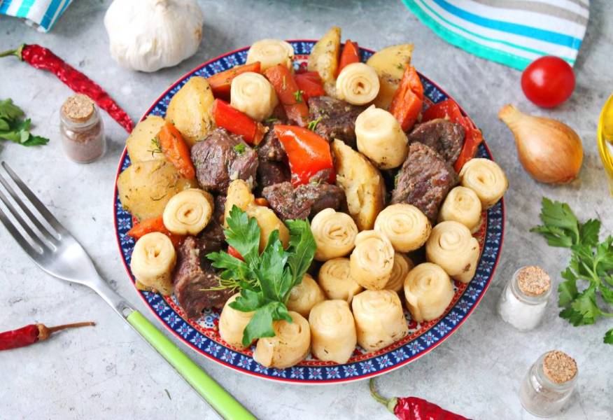 Приготовьте на обед или праздничный стол вкусное, сытное блюдо кавказской кухни. В нем много овощей, мяса, а воздушные рулетики отлично их дополняют. Берите рецепт на вооружение!