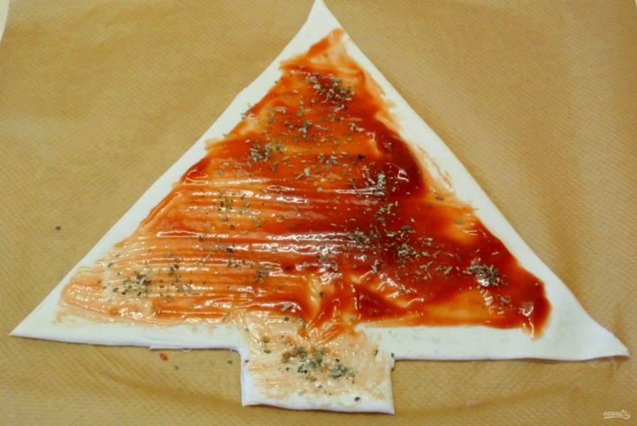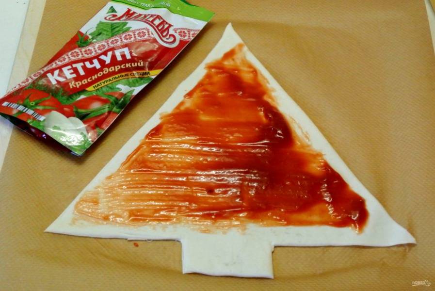 Один треугольник теста переложить на бумагу для выпечки, где и будем формировать пирог. Выложить кетчуп "Краснодарский" Махеевъ, распределить равномерно кисточкой.