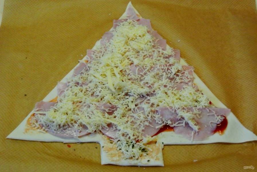 Выложить тонко нарезанную ветчину. Можно нарезать ветчину мелко.