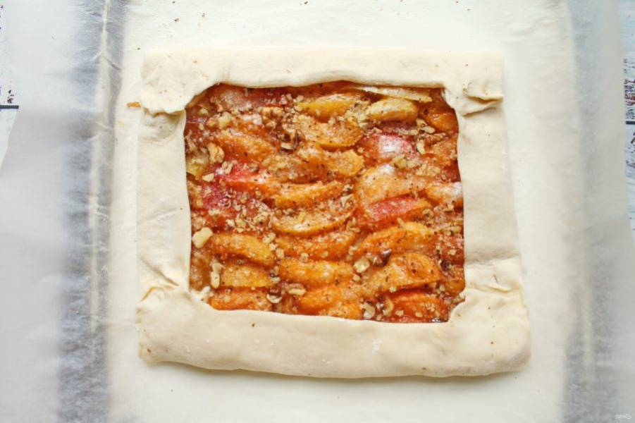 У абрикосов удалите косточки, порежьте на дольки и разложите в один слой на тесто, отступив от края по 3-4 сантиметра.