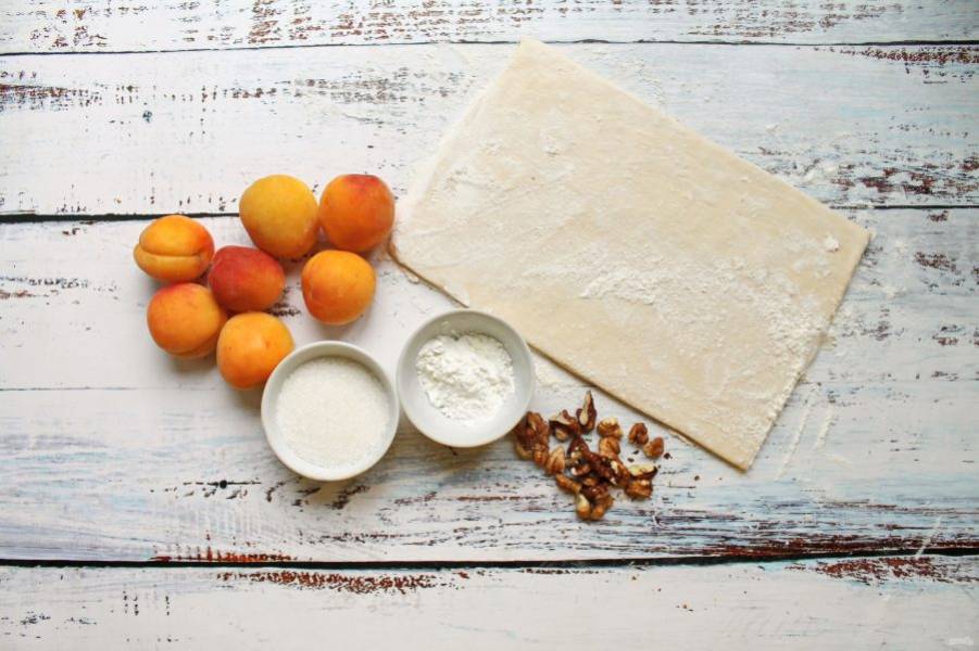 Подготовьте все необходимые ингредиенты для приготовления слоеного пирога с абрикосами. Тесто достаньте заранее из морозилки, чтобы стало мягким. Абрикосы тщательно вымойте и обсушите.