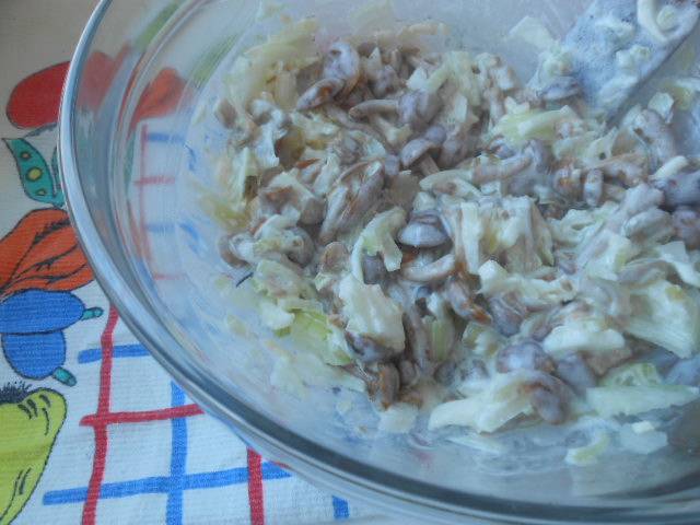 Грибы промыть,крупные разрезать попалам.Лук нарезать тонкими полукольцами(у меня чуток мельче).Добавить сметану,соль,перец,тимьян.Хорошо перемешать.