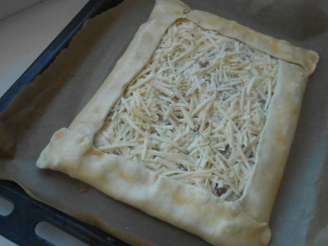 Посыпать тертым сыром и завернуть края.Смазать края пирога яйцом.