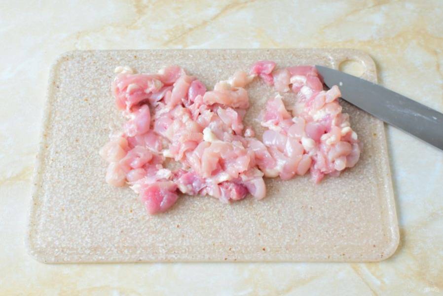Шампиньоны промойте от загрязнений, обсушите и нарежьте на мелкие кусочки.