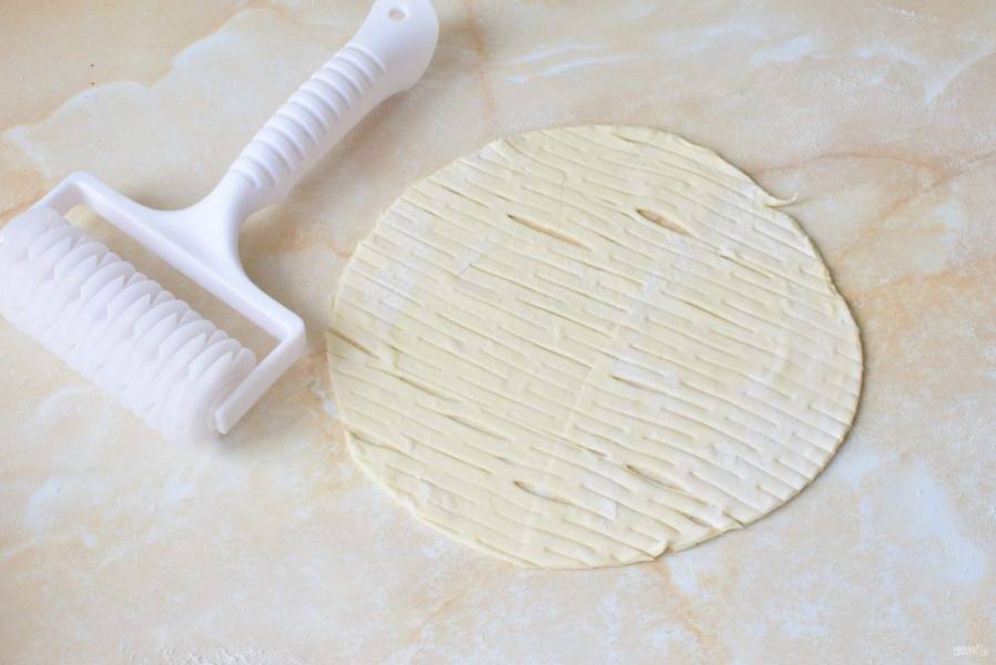 Половину слоеного теста немного раскатайте и выложите в форму для выпечки (22 см.), оставляя небольшие бортики.