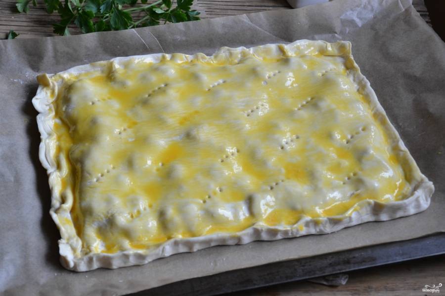 Накройте пирог вторым листом раскатанного теста. Скрепите края. Сделайте 6-8 проколов вилкой по поверхности пирога и смажьте взбитым яйцом. Отправьте пирог в разогретую духовку на 25 минут.