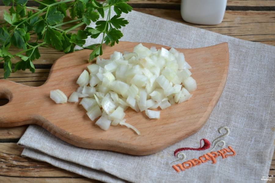 Мелко порубите репчатый лук и отправьте к рыбному филе, жарьте до мягкости лука.