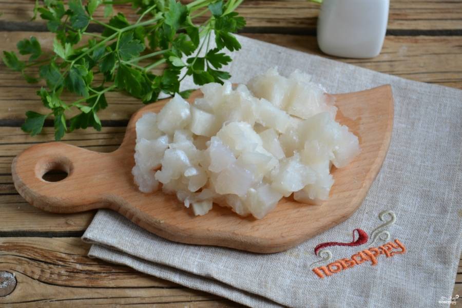 Для начинки мелко порежьте филе пангасиуса, предварительно разморозив его. Отправьте рыбу в сковороду и обжарьте в небольшом количестве растительного масла.
