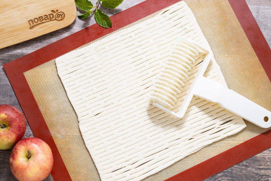 Раскатайте вторую часть теста по размеру первой. Сделайте надрезы специальным валиком или ножом.