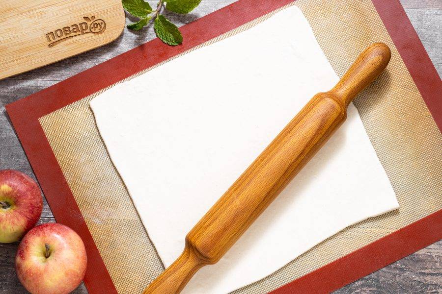 Тесто разделите на две равные части. Присыпьте один пласт теста мукой, раскатайте до толщины примерно 5 мм.