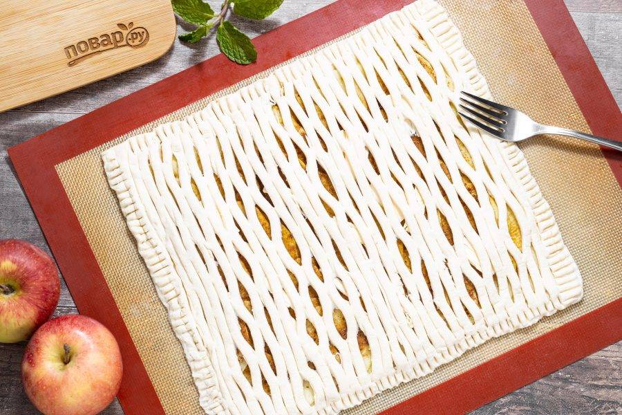 Края теста прижмите, чтобы они скрепились. Можно пройтись вилкой для надежности. Выпекайте яблочный пирог в разогретой до 200 градусов духовке примерно 20-25 минут до румяного цвета. Пирог можно предварительно смазать яйцом или маслом.