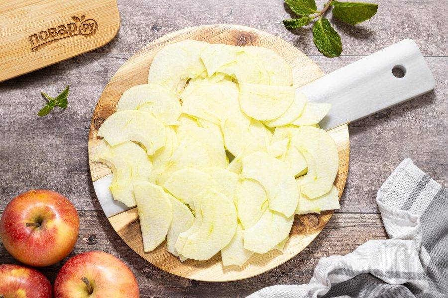 Яблоки помойте, очистите от кожуры и нарежьте на тонкие ломтики. Чтобы яблоки не темнели, можно сбрызнуть их лимонным соком.