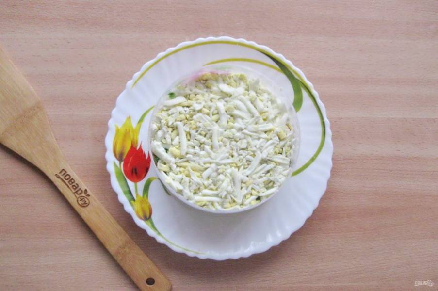 Яйца сварите вкрутую, охладите и очистите. Натрите на терке и выложите на лук. Покройте небольшим слоем майонеза.