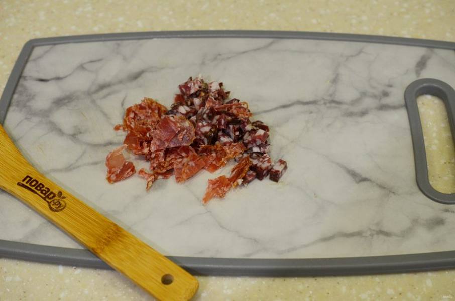 2. На тарелку поставьте формовочное кольцо и выложите первым слоем колбасу, затем немного майонеза.