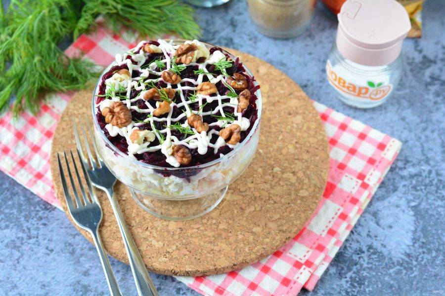Украшайте салат слегка подсушенными орешками, дайте пропитаться минут 20 в холодильнике. Готово. Приятного вам аппетита!