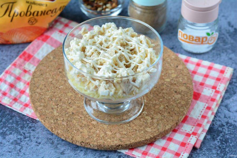 Вторым слоем выложите куриное мясо, полейте майонезом.