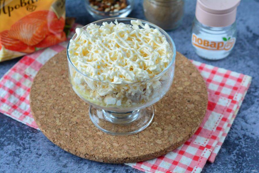 Затем натрите на терке плавленый сыр, распределите следующим слоем, полив майонезом.