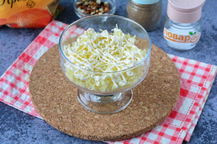 Первым слоем выложите картофель, чуть посолите, поперчите по вкусу и полейте майонезом.
