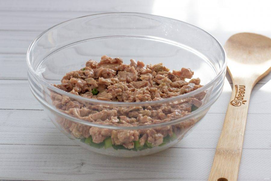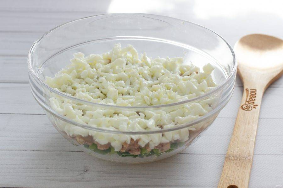 Яйца очистите и разделите на белки и желтки. На печень выложите натертый на крупной терке слой белков. Смажьте небольшим количеством майонеза.