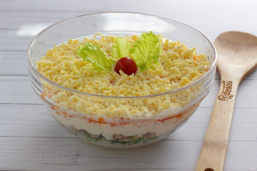 На мелкой терке натрите желтки и выложите последним слоем. Украсьте салат по своему вкусу и дайте немного пропитаться.