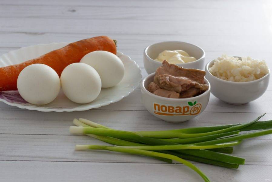 Подготовьте все необходимые ингредиенты. Рис, морковь и яйца заранее отварите.