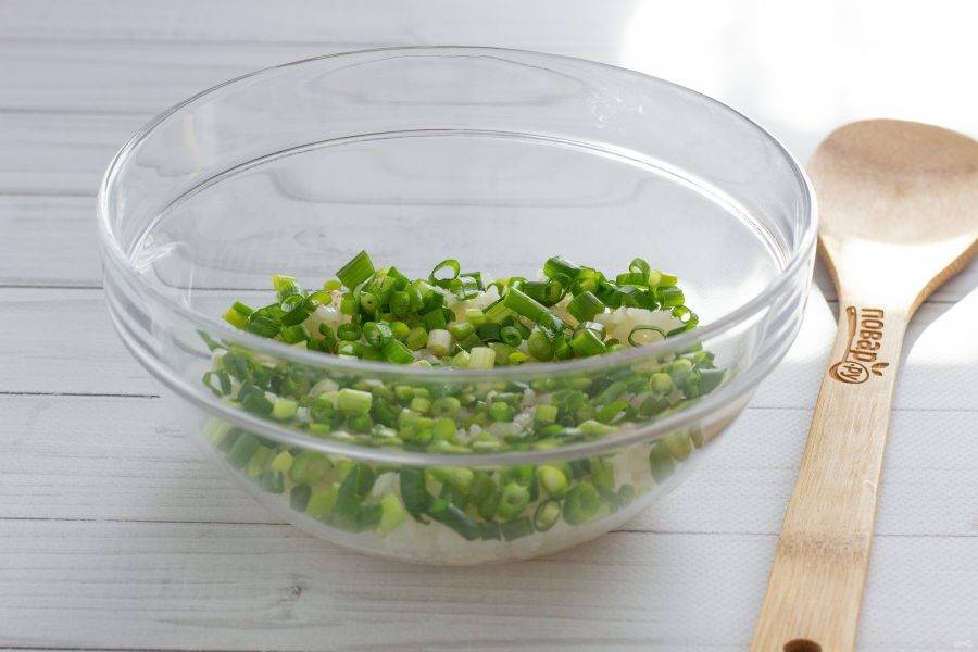 Зеленый лук помойте и мелко порубите. Выложите следующим слоем на рис.