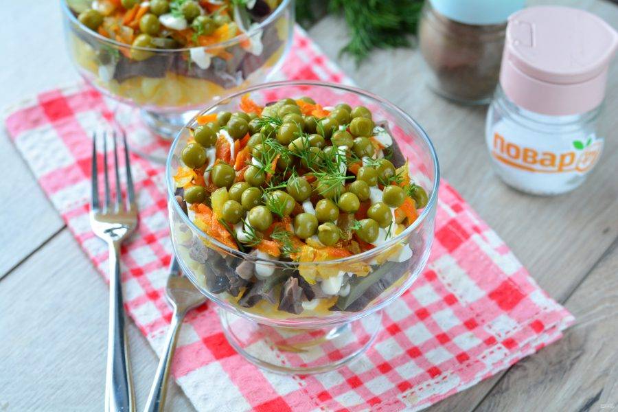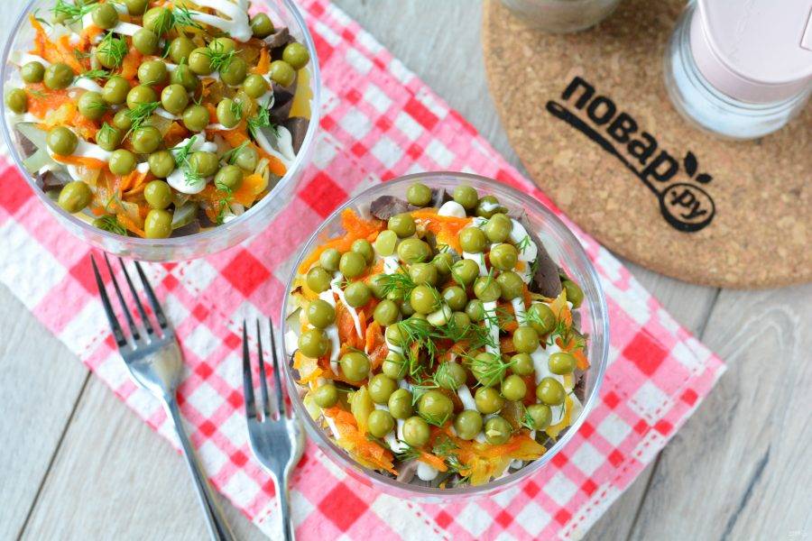 Последний слой — консервированный горошек. Готово. Салат поставьте в холодильник на 20 минут, пусть пропитается.