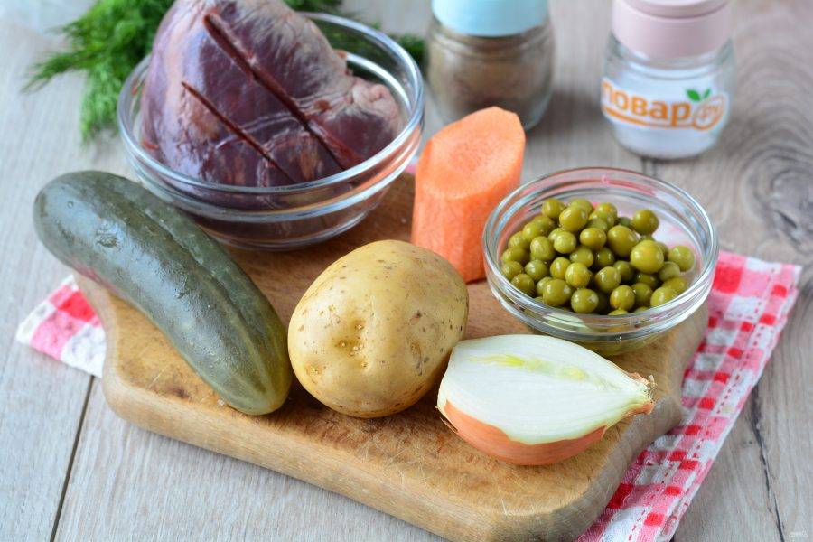Питательным и вкусным получается слоеный салат с сердцем. Также возьмите соленые огурцы, консервированный горошек, картофель и лук с морковкой. Для заправки используйте майонез.