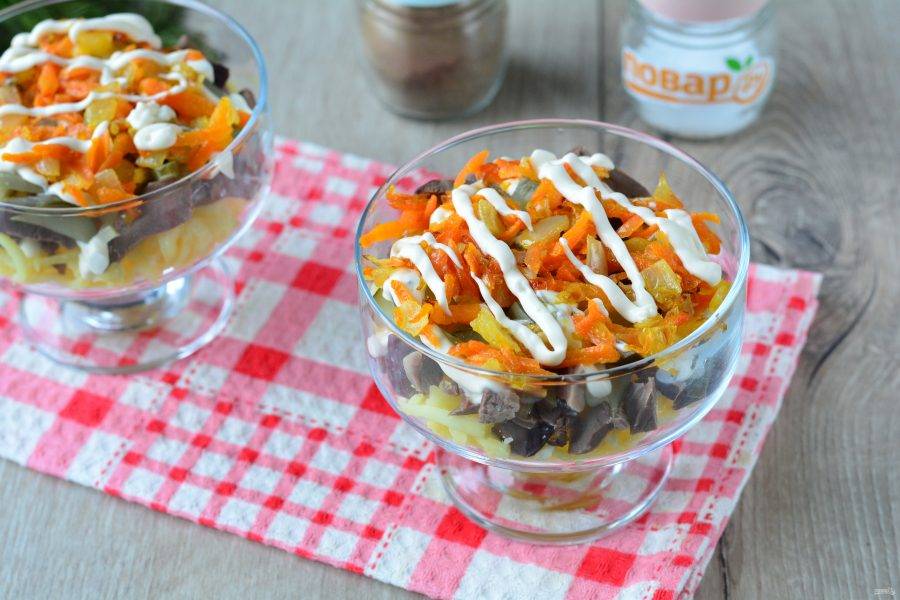 Вторым слоем выложите кусочки вареного сердца, полейте соусом.