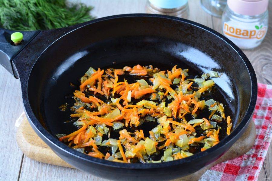 Обжаривайте лук с морковкой в сковороде с небольшим количеством масла. Жарьте 3-4 минуты до мягкости помешивая.