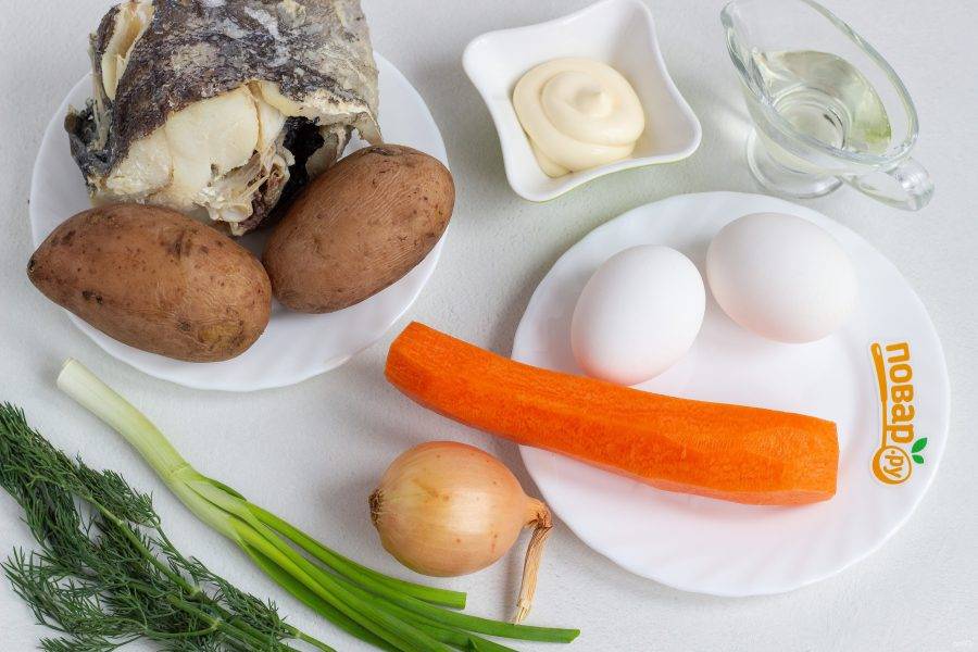 Подготовьте все необходимые ингредиенты. Рыбу заранее отварите, как описано в инструкции приготовления выше. Одну морковь, картофель и яйца тоже отварите заранее и остудите.